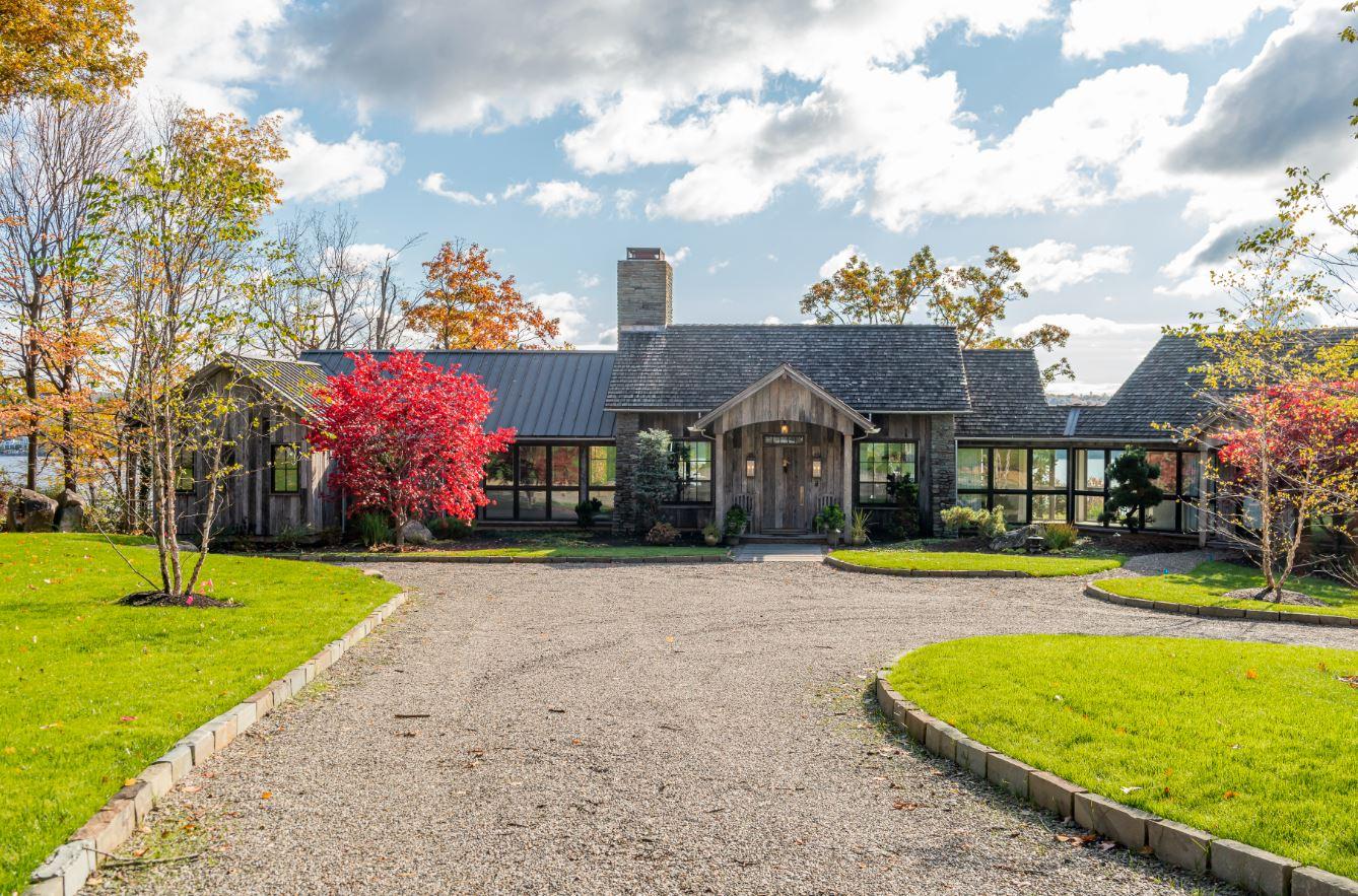 For this home located in Snedens Landing on the Hudson River, JLF Architects and builders Big-D Signature took cues from the surrounding landscape with a linear layout that naturally follows the bluff-top to make the most of its river vantage point without disturbing the wooded environment. This included a naturalistic gravel driveway outlined with stone that follows the curved yard landscaping to enhance the home’s understated rural cottage aesthetic.