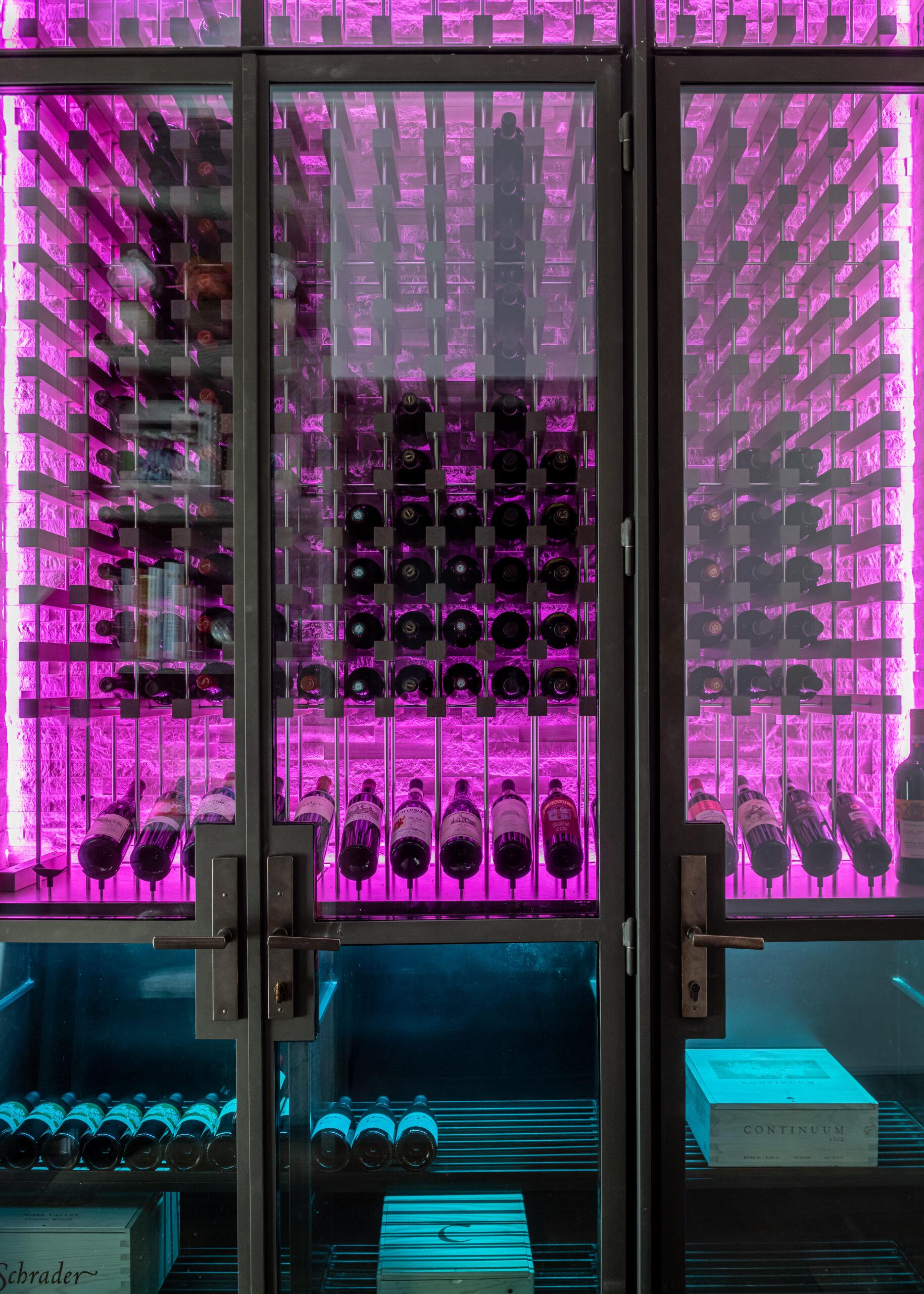 JLF Architects and construction partner Big-D Signature built a custom wine closet for the owners of a Jackson, Wyoming home who love to entertain. The space includes a custom enclosure, cooling, racks, and case storage for serious wine lovers and is lit up with dramatic purple LED lighting for a theatrical effect.